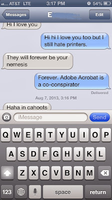 Uncle G is one of Daddy P's closest friends, and we grew up with them like family. He also happens to own a printing business, which can be pretty useful in the world of wedding stationary. My first plan was to buy a customized save the date design from an Etsy seller, and get Uncle G to print it. I never really entertained the notion of printing out our stationary, even it was DIY. You see, I have a big problem with printers. We just don't get along. A recent text to Sphinx about a situation at work will show you...